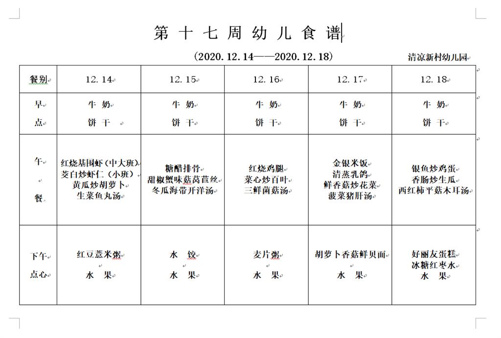 第十七周幼儿食谱